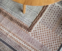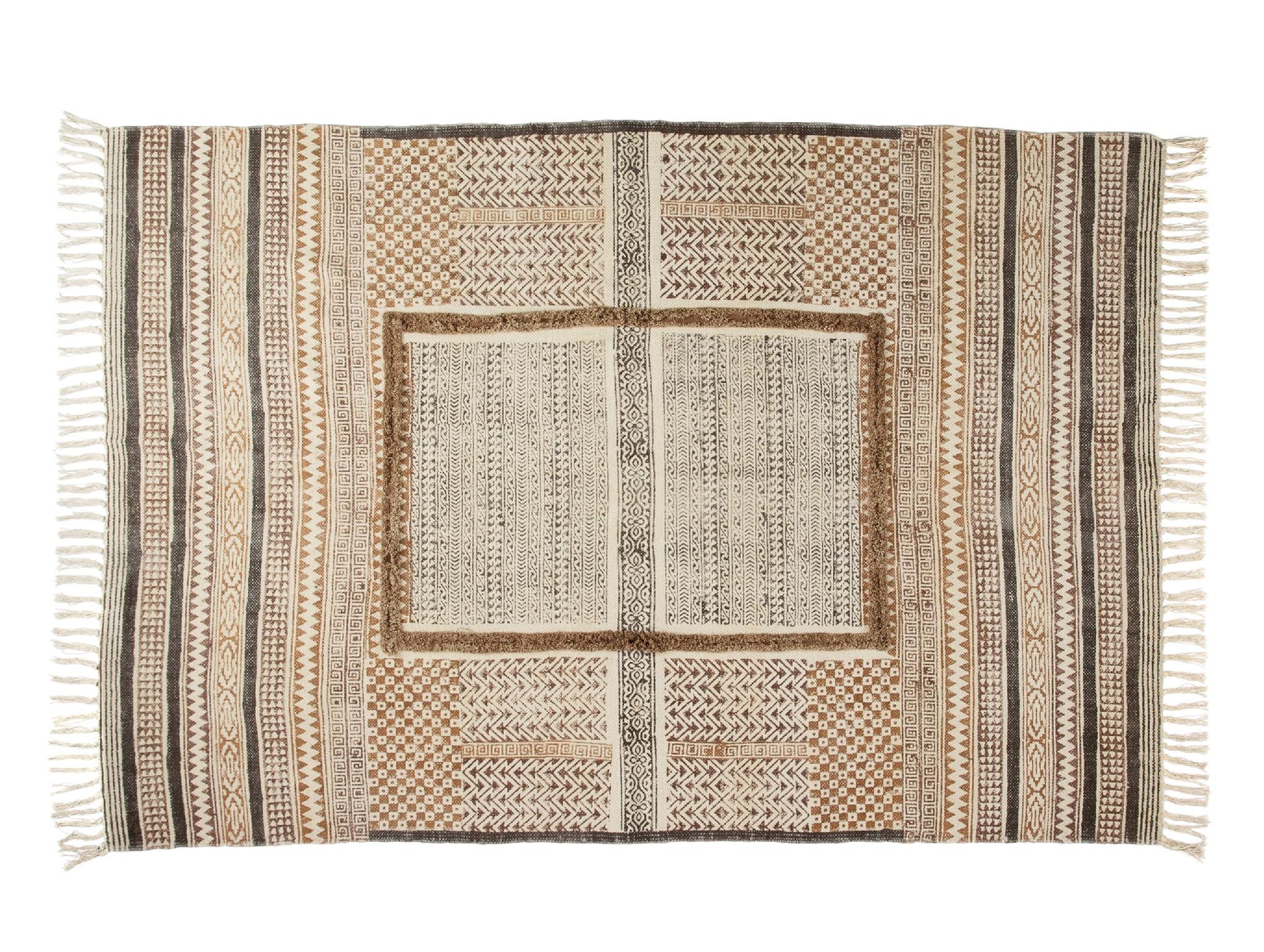 Alfombra rectangular Andrea House tejida en algodón con un diseño étnico y boho en tonos cálidos marrones, naranjas, beige y blanco, decorada con flecos laterales que aportan carácter visual y textura. Su estilo acogedor la convierte en pieza ideal para salones, dormitorios o zonas de paso donde se quiera sumar calidez y personalidad al ambiente.