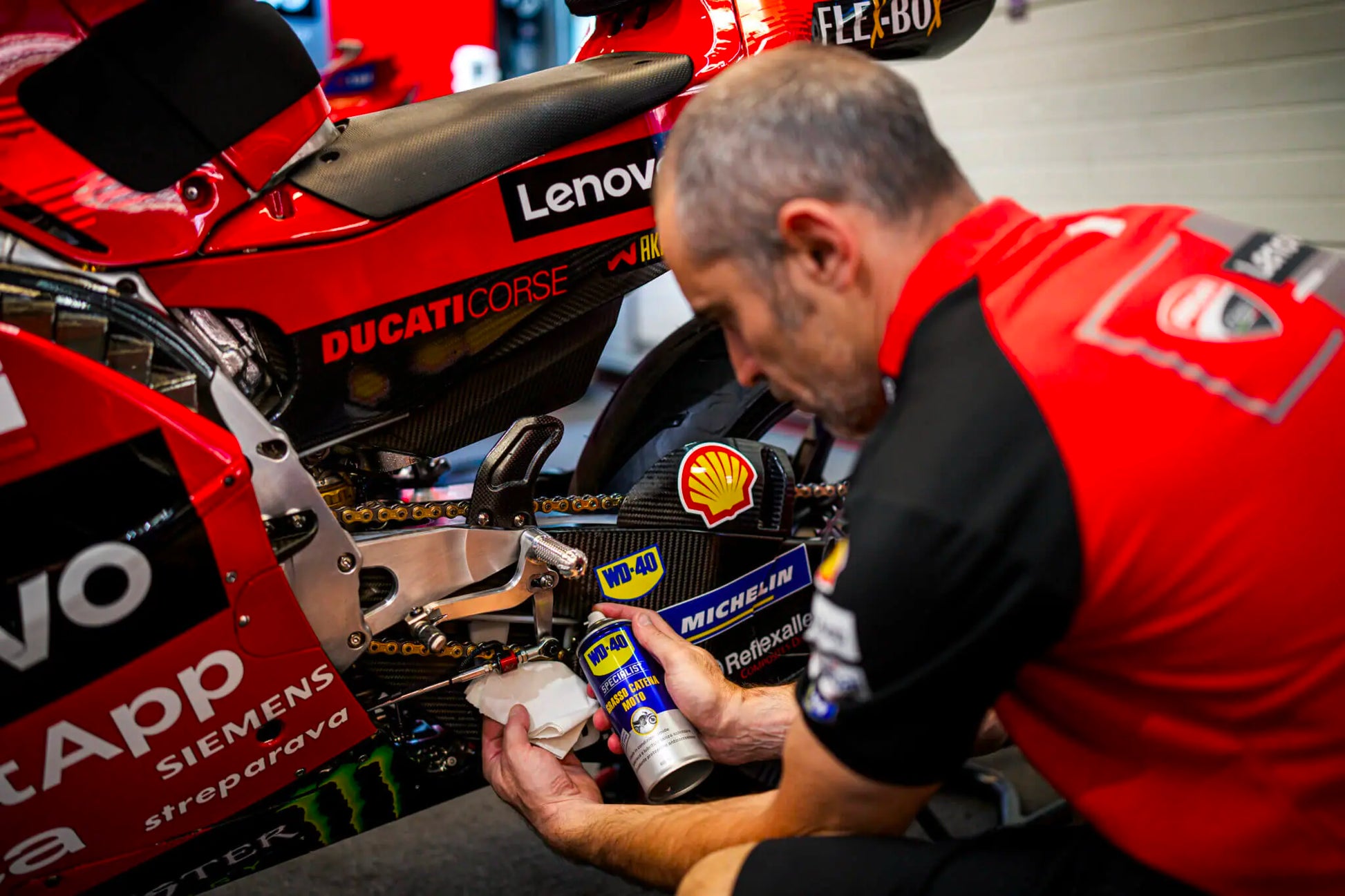 2. Pulveriza WD-40 Specialist Moto Grasa de Cadenas Ambiente Húmedo sobre la cadena limpia.