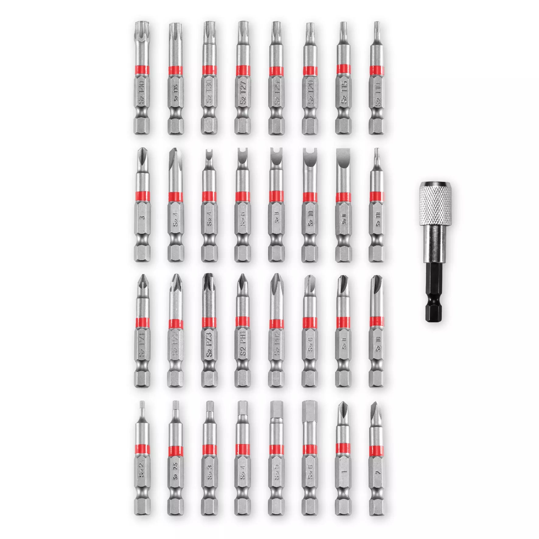 - Torx (TX): 1x TX10, 1x TX15, 2x TX20, 2x TX25, 1x TX27, 1x TX30, 1x TX40