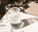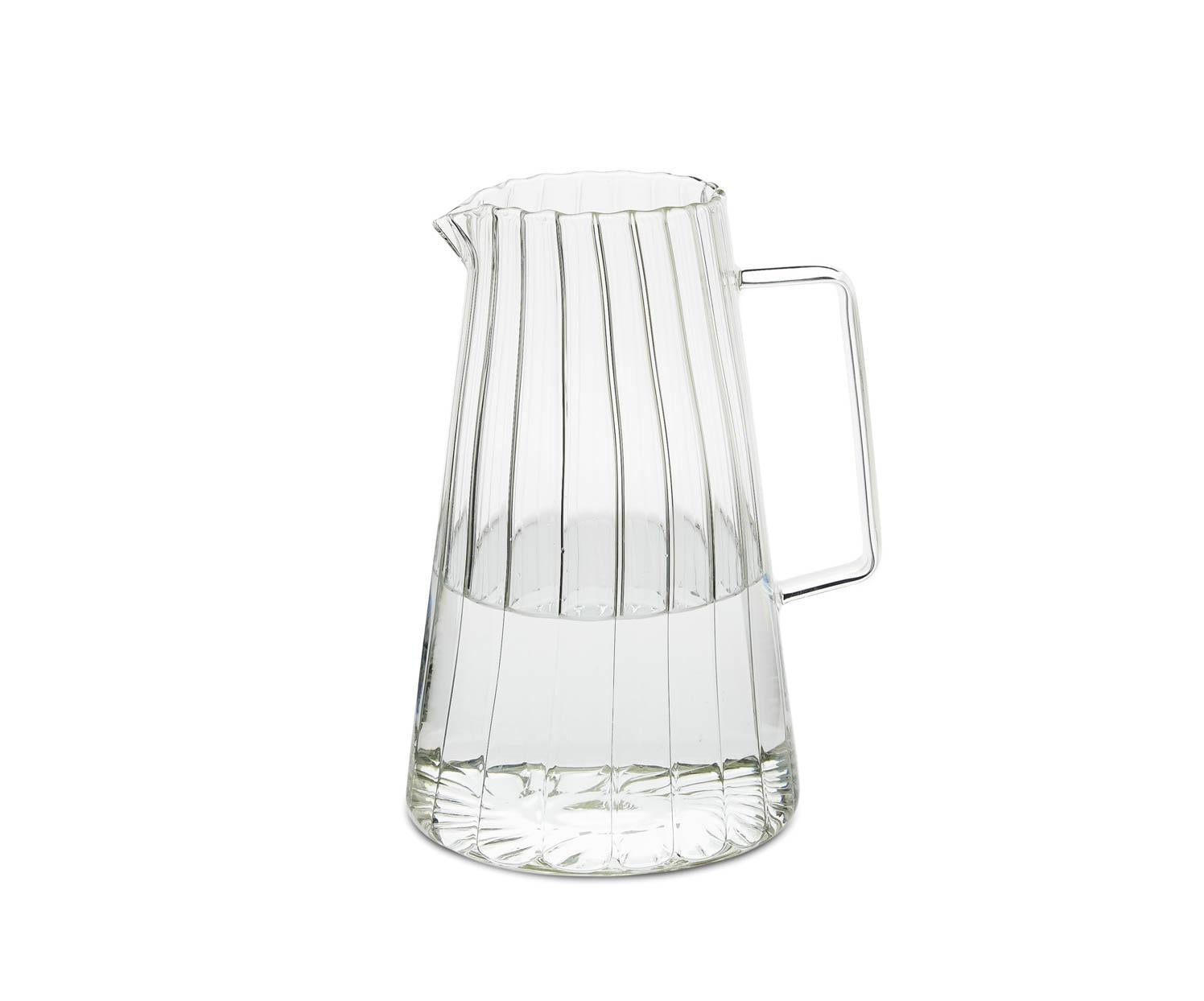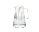One-liter glass water pitcher with a classic striped design and ergonomic handle , perfect for serving water or other beverages at the table or keeping them cool in the refrigerator. Its timeless style complements any table setting and décor.