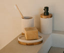 Elegant bathroom dispenser made of beige polyresin with natural acacia wood details, designed to dispense liquid soap with style and functionality. Its neutral and warm aesthetic blends seamlessly into contemporary or classic bathrooms.