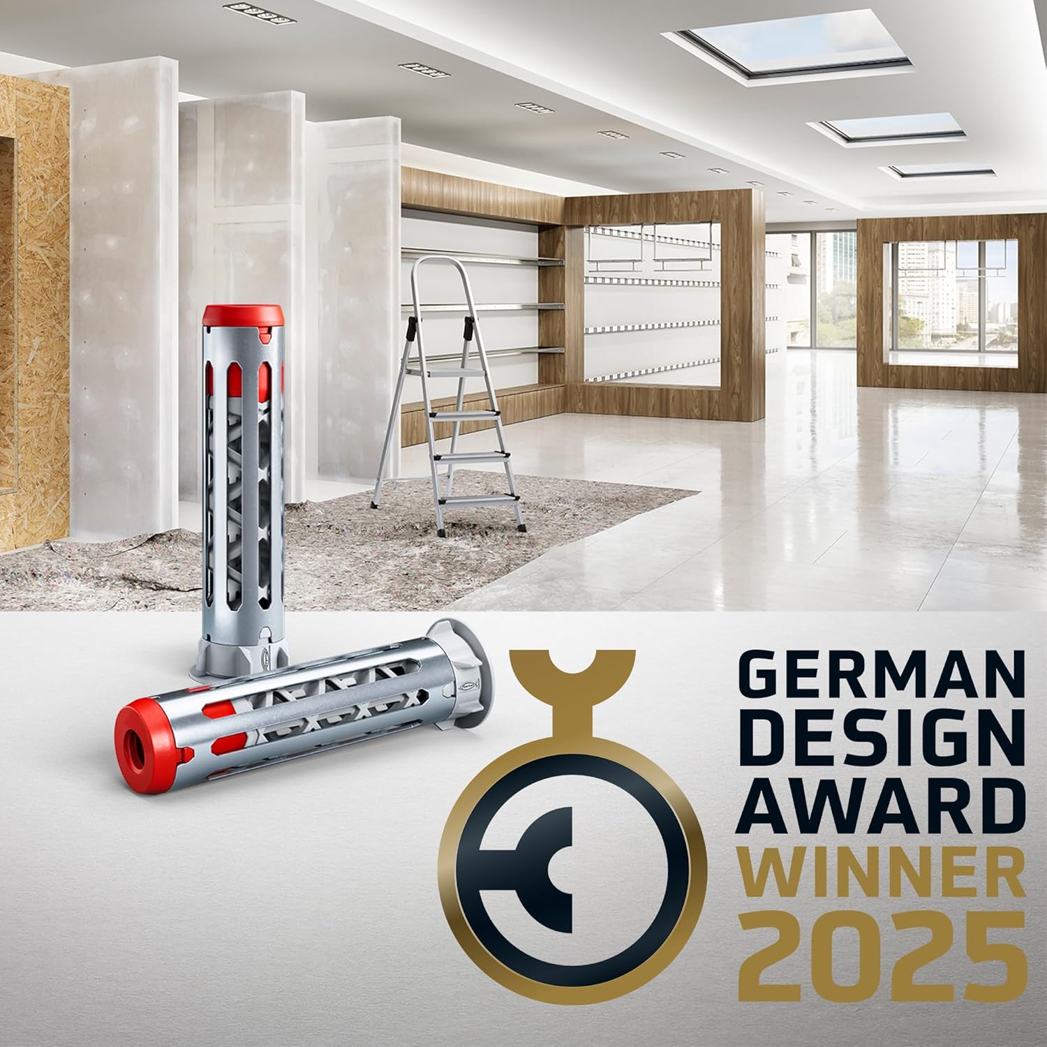 • Simple installation : with TX screw for quick and reliable assembly. During pre-assembly, the metal sleeve is folded behind the building material and pressed against the back of the plate, while the plastic plug extends into the building material. Assembly is quick and easy using a cordless screwdriver, reducing assembly time by up to 50% compared to conventional plugs.