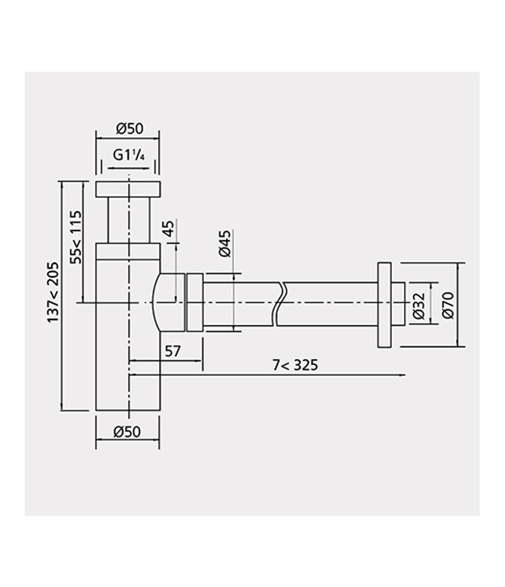 Chrome siphon for sink from the Wirquin brand. Adjustable siphon in chromed brass. 1 1/4 entry. Height from 137 to 205 mm. Tube diameter 32 mm and length 325 mm