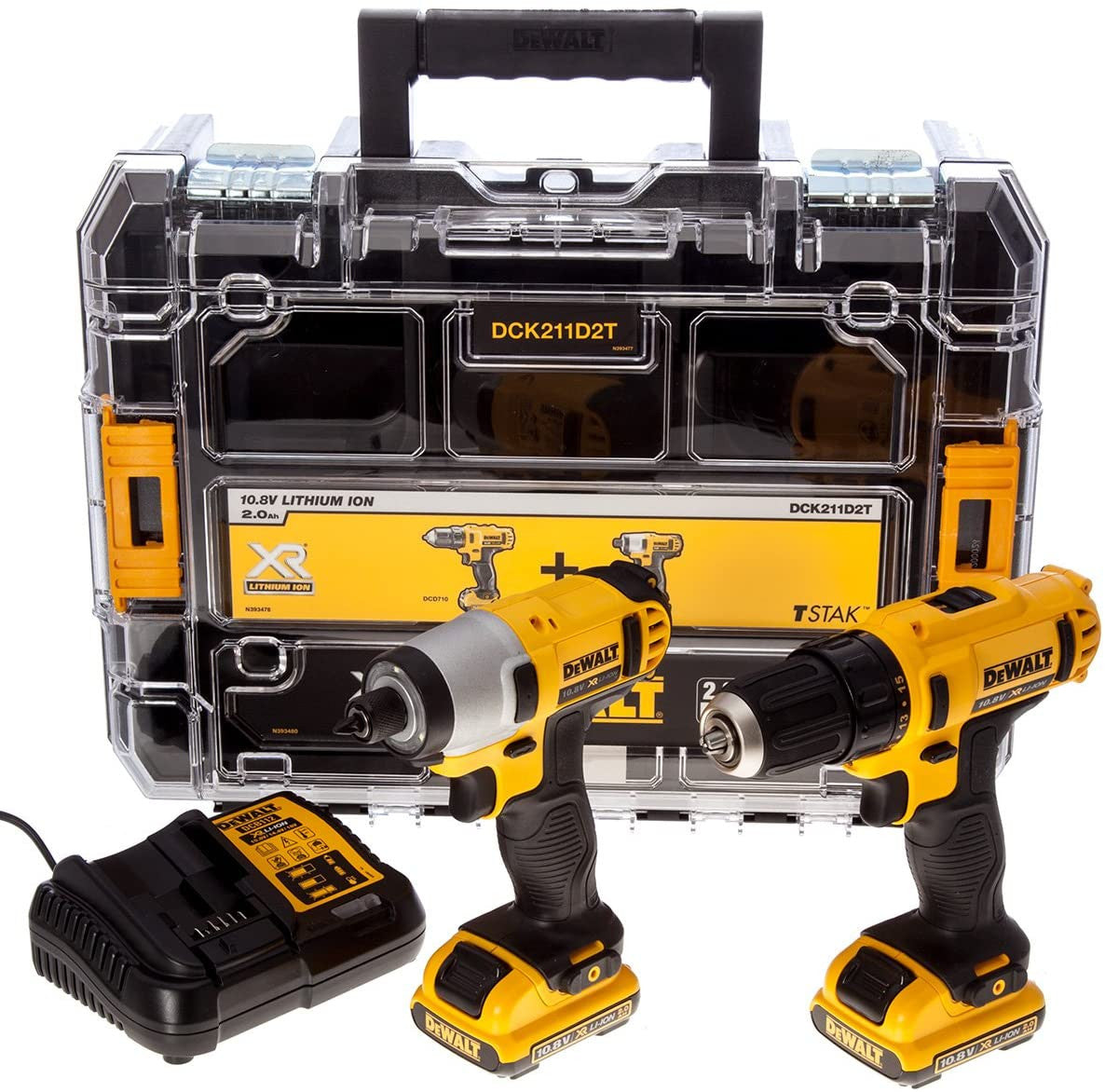 Dewalt DCK211D2T Set, a Kit that contains: DCD710 Drill Driver, DCF815 Impact Driver and TSTAK V Organizer. Includes two 2.0 Ah batteries and charger.