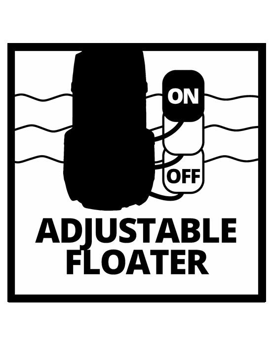 - The continuously adjustable float switch automatically turns the pump on and off for a preset water level.