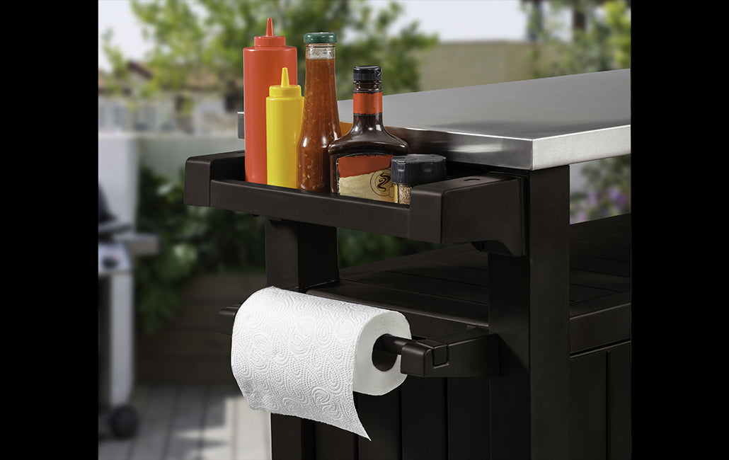 Extra Table for Keter Unity XL Barbecue. A magnificent solution from the Keter brand for auxiliary furniture for barbecues, but with a totally versatile use. Made of top-quality resin that is completely weather-resistant, the Keter Utility XL has a metal countertop to facilitate use as a kitchen and a storage capacity of 279 liters. Warm, practical and robust!