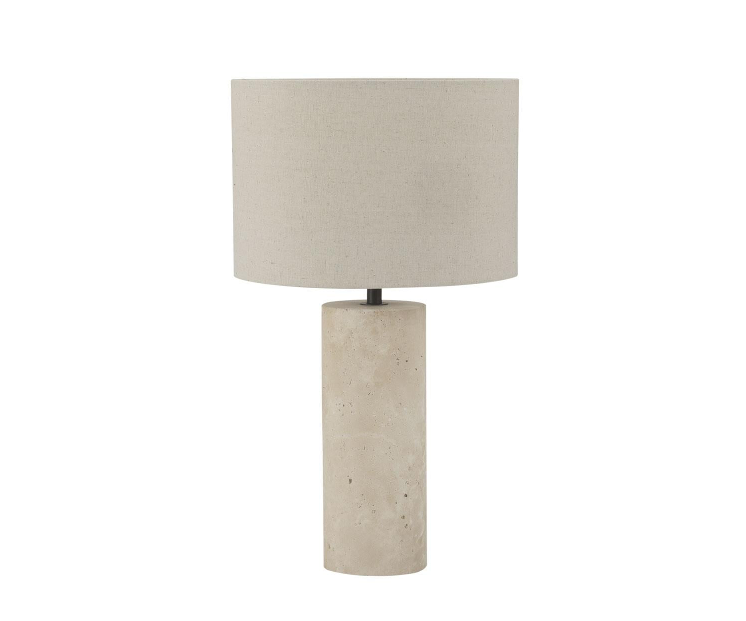• Natural and noble materials: travertine body that adds weight and texture, combined with a linen shade that softens the lighting.