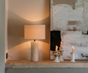 The Glow decorative lamp by Andrea House features a natural travertine base and a beige linen shade , designed to create a soft, ambient light in living rooms, bedrooms, or reading spaces. Its organic aesthetic adds visual and textural warmth to any corner of the home.