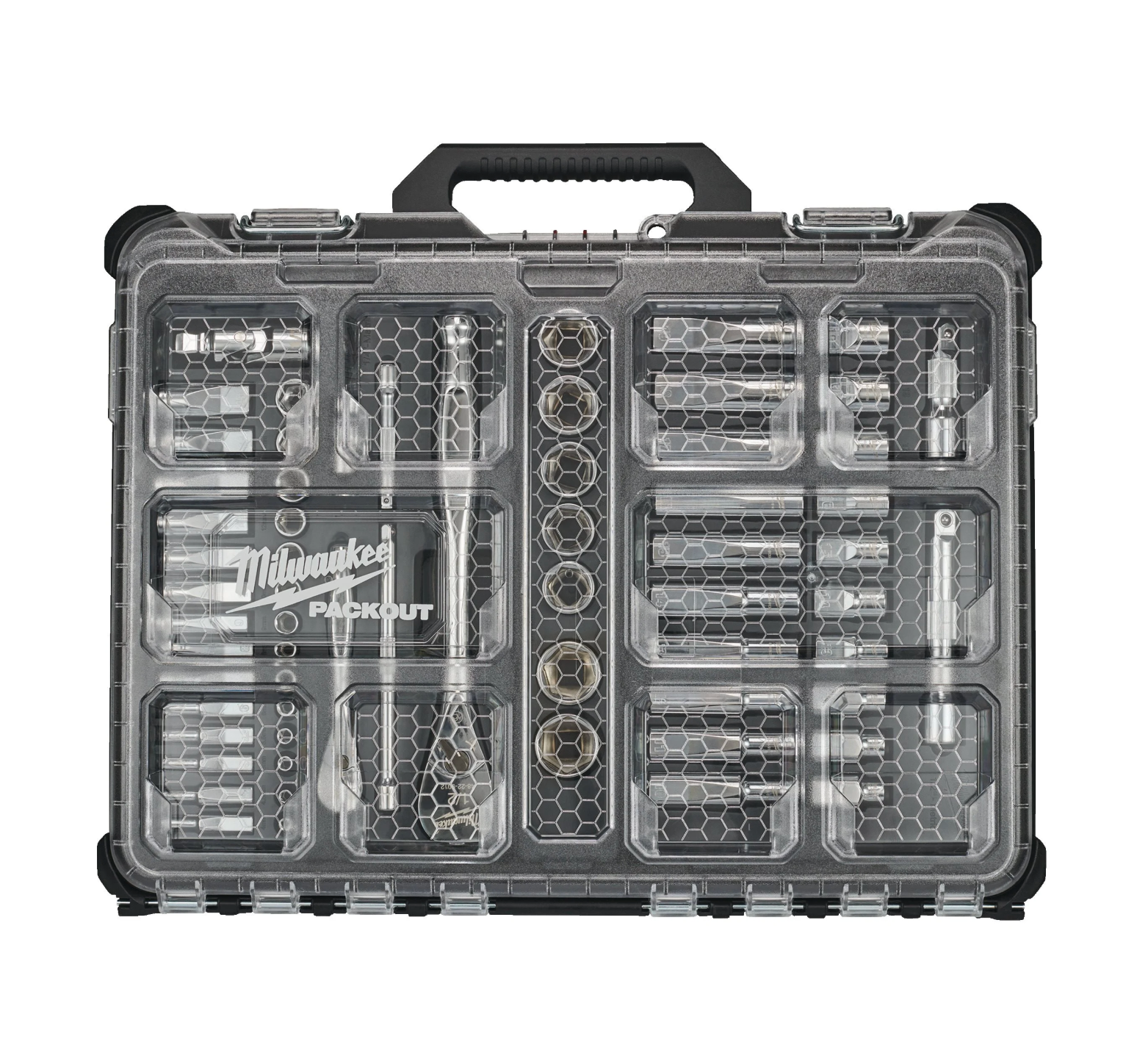 The Milwaukee 63-Piece 1/4" and 1/2" Drive Socket and Ratchet Set is a comprehensive hand tool set designed for mechanics, technicians, and professionals who need a complete solution of metric sockets and ratchets in a compact and portable package . The set comes in a compact Slim organizer compatible with the PACKOUT™ modular system , allowing for organized storage and integration with other PACKOUT modules.