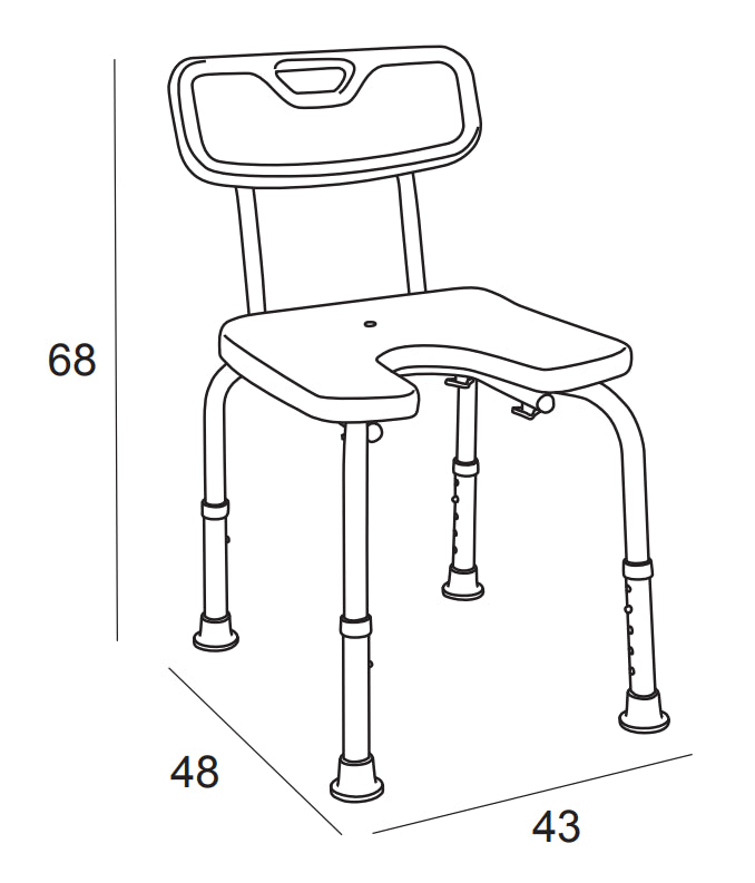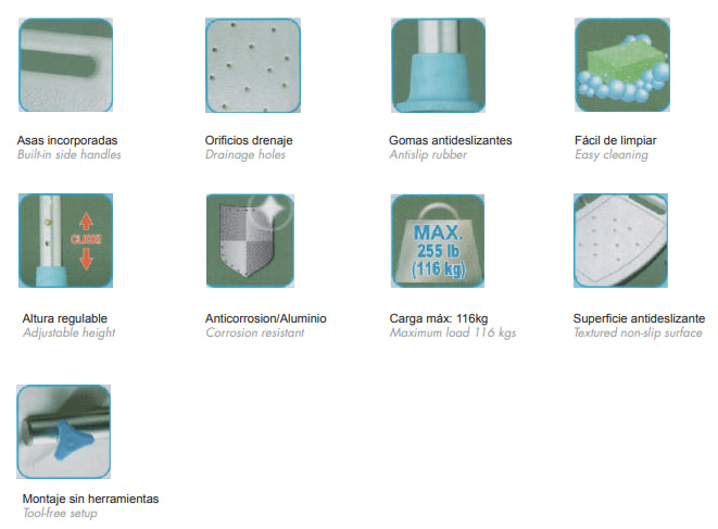 Shower seat with backrest so you can sit while you soap up in complete safety. An essential and beautiful technical help. With adjustable legs. In Aluminum + ABS.